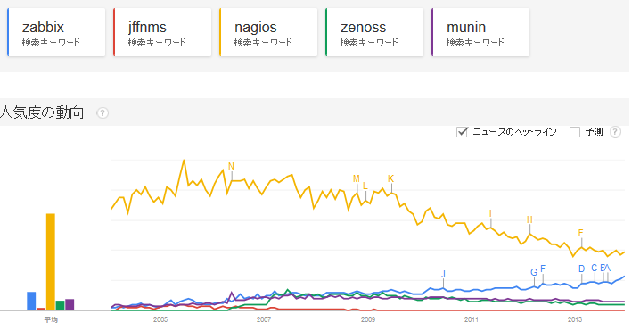 Zabbixを使っているがなんとなくいまいち。自分の使い方が悪いのか、傾向として別のツールがはやっているのかを確認するためにGoogle Trendで動向を見てみる。