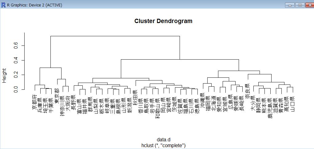 Rで読み込む際に県データを行名にする(row.names=1)。これによりクラスタリング実行時に各データが県で表示される。実施しないと行番号になるために識別が難しい。