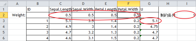 • 主成分 U  =SUMPRODUCT($C$2:$F$2,C3:F3)
