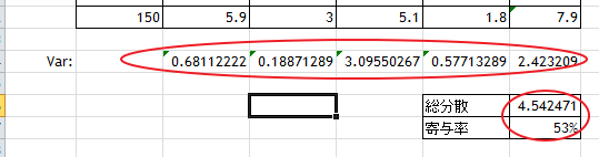 • 主成分には分散が大きな変数が寄与するので、各変数の分散を求めれば主成分負荷量の大きさについてある程度目安が立つ。