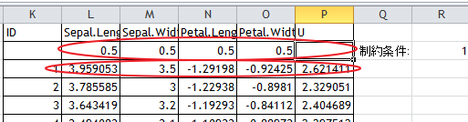 目的とするセルは主成分uの分散である。変化する値は主成分負荷量。制約条件として∑主成分負荷量i^2=1となるのでこれを設定してソルバーを実行する。