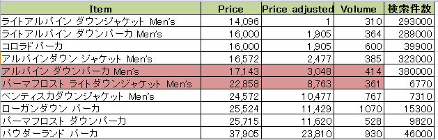 この2つについて人気度を調べる。アルパインダンパーカは380,000件であり全商品の中でトップとなった。それに対して、パーマフロストライトダウンジャケットは6770件であり、10商品中10位である。このことからモンベルが力を入れている商品はアルパインダウンパーカであると考えられる。同系統の商品でアルパインダウンジャケットがありこちらもほぼ金額としては同一であり、この2種が主力といえる。