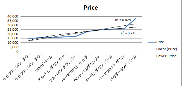 算術平均は21,639である。線形近似線の重相関係数は0.829であり、累乗近似線の重相関係数より高い。この値に近い商品は幾何平均と同じでアルパインダウンパーカとパーマフロストライトダウンジャケットとなる。しかし価格としてはパーマフロストライトダウンジャケットに近づいている。