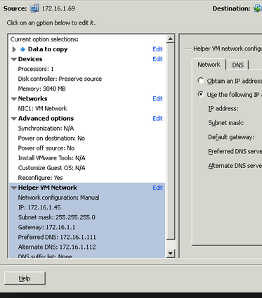変換時にはHelper VMという仮想化をお助けする仮想マシンが一時的にできるらしい。問題はこの仮想マシンに割り当てられるIPアドレスがDHCPで構成されるようになっていることだ。DHCPサーバーが同じサブネットにない場合にはIPアドレスの割り振りがうまくいかないために、エラーとなる。