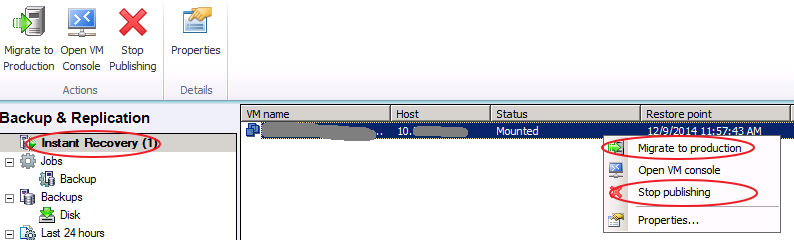この画面が出るとリストアされたVMはバックアップファイルからInstant Recoveryの実行環境に移されていて、リストアが正しく実行されたか評価できる。この環境で実施された変更はすべて別のredoログに記録される。