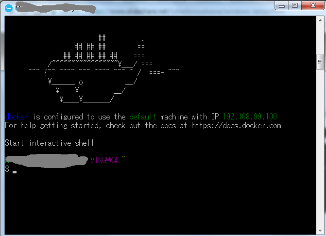 コンソールを開くためにDocker Quickstart Terminaをクリックするとターミナルが開き、起動処理が実行される。