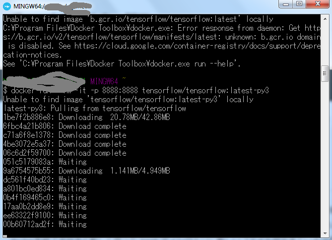 起動が完了するとプロンプトが表示される。これでtensorflowを導入する準備が整った。