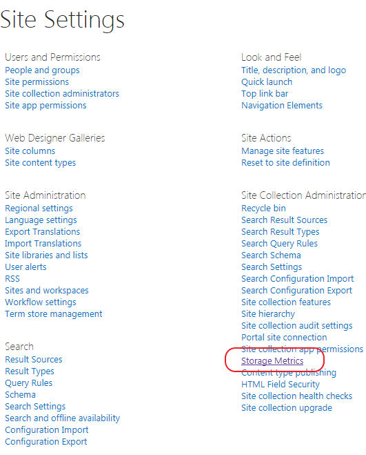 Site Settings右下にあるStorage Metricsを選択