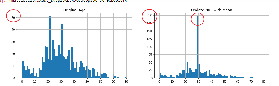 import numpy as nm import pandas as pd import seaborn as sns %matplotlib inline d_train = pd.read_csv('train.csv') d_train['Age_1'] = d_train['Age'] fig, (axis1,axis2) = plt.subplots(1,2,figsize=(15,4)) axis1.set_title('Original Age') axis2.set_title('Update Null with Mean') d_train["Age_1"] = d_train["Age_1"].fillna(29.69911764705882) d_train['Age'].hist(bins=70, ax=axis2) d_train['Age_1'].hist(bins=70, ax=axis4)