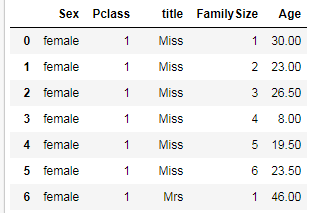 d_train = pd.read_csv('train.csv') d_train['title'] = d_train['Name'].apply(get_title).map(Title_Dictionary) d_train['FamilySize'] = d_train['SibSp'] + d_train['Parch'] + 1 d_train_g = d_train_g = d_train.groupby(['Sex','Pclass','title', 'FamilySize']) d_train_g_m = d_train_g.median() d_train_g_m.reset_index()[['Sex', 'Pclass', 'title', 'FamilySize', 'Age']]