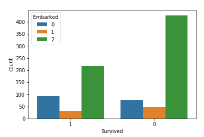<div>sns.countplot(x='Survived', hue="Embarked", data=d_train, order=[1,0])</div>