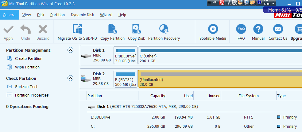 そこでMini Tool Partitionを利用して二つ目のpartitionを作成する。