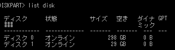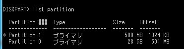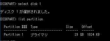 Disk 1がUSBであることがわかる(サイズから)。Disk 1を選ぶ。現在のpartitionを確認する。