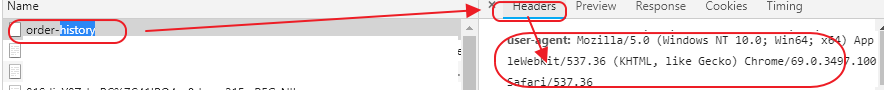 こちらはChromeの開発ツールを開き、ページをリクエストする。ここから[Header]->[User Agent]とたどればよい。