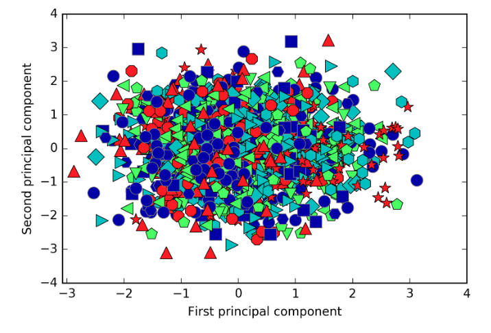 同じマーク、例えば赤の▲は同じ人物を表す。マークがある特定の位置に固まっていれば第一および第二主成分で分類可能といえる。しかし実際に見てみるとどのマークも円状に分散している。これは第一および第二主成分のみでは人物の識別が難しいことを意味する。実際に第一および第二主成分のみで画像を復元してみると、視覚上、識別は困難である。